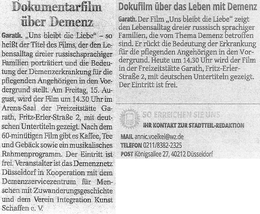"Dokumentarfilm über Demenz" Westdeutsche Zeitung, 15.08 und 8.09.2014 |